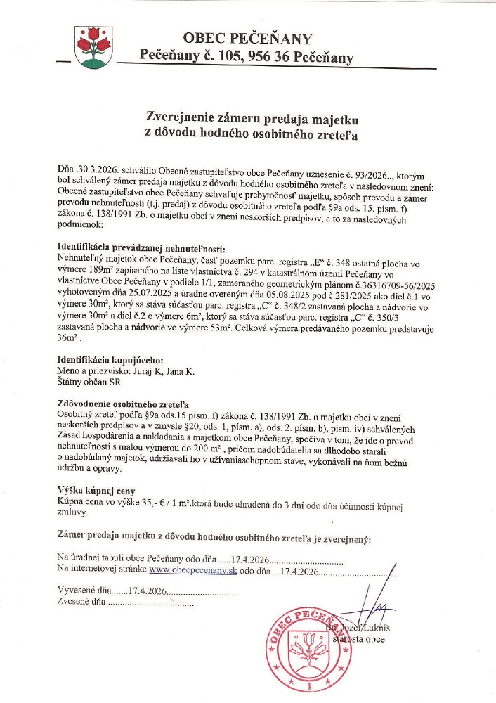 Nehnuteľný majetok obce Pečeňany, časť pozemku parc. registra „E“ č. 348 ostatná plocha vo výmere 189m² zapísaného na liste vlastníctva č. 294 v katastrálnom území Pečeňany vo vlastníctve Obce Pečeňany v podiele 1/1, zameraného geometrickým plánom č.36316709-56/2025 vyhotoveným dňa 25.07.2025 a úradne overeným dňa 05.08.2025 pod č.281/2025 ako diel č.1 vo výmere 30m², ktorý sa stáva súčasťou parc. registra „C“ č. 348/2 zastavaná plocha a nádvorie vo výmere 30m² a diel č.2 o výmere 6m², ktorý sa stáva súčasťou parc. registra „C“ č. 350/3 zastavaná plocha a nádvorie vo výmere 53m². Celková výmera predávaného pozemku predstavuje 36m²